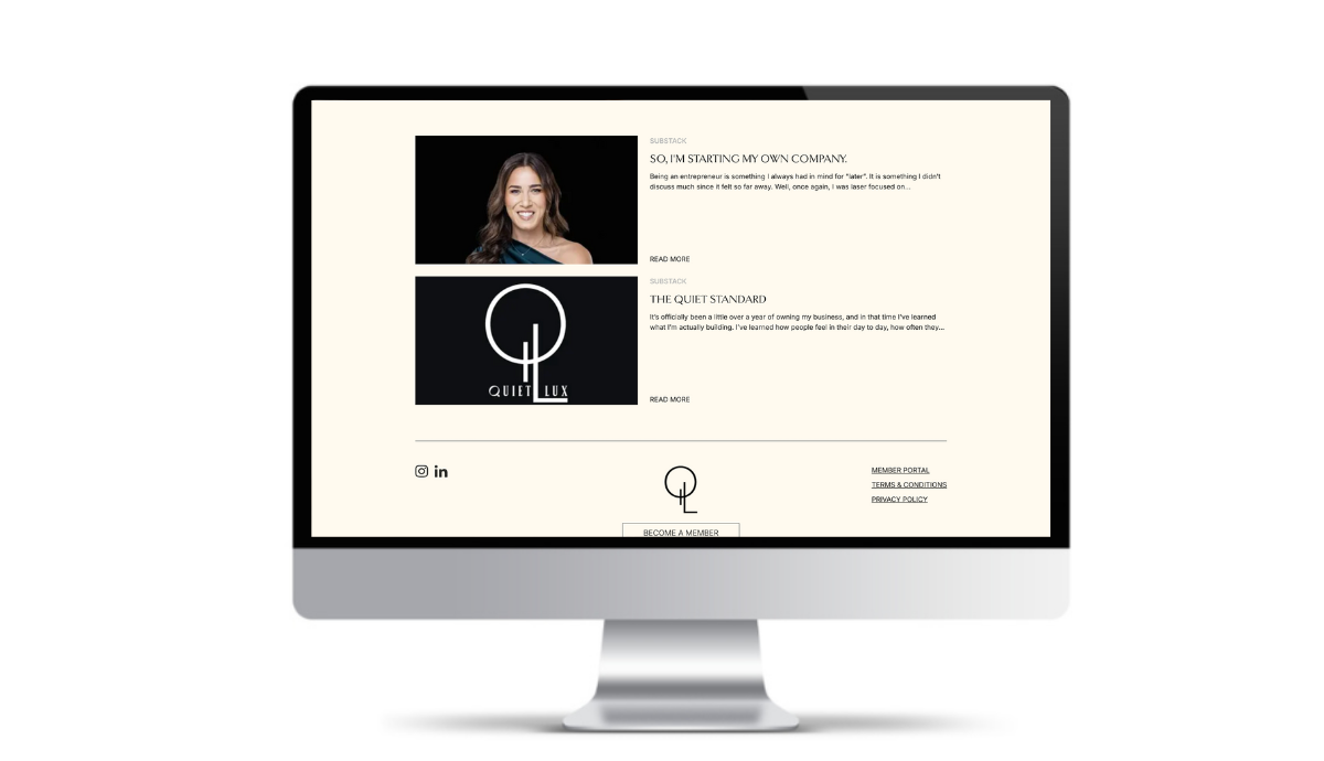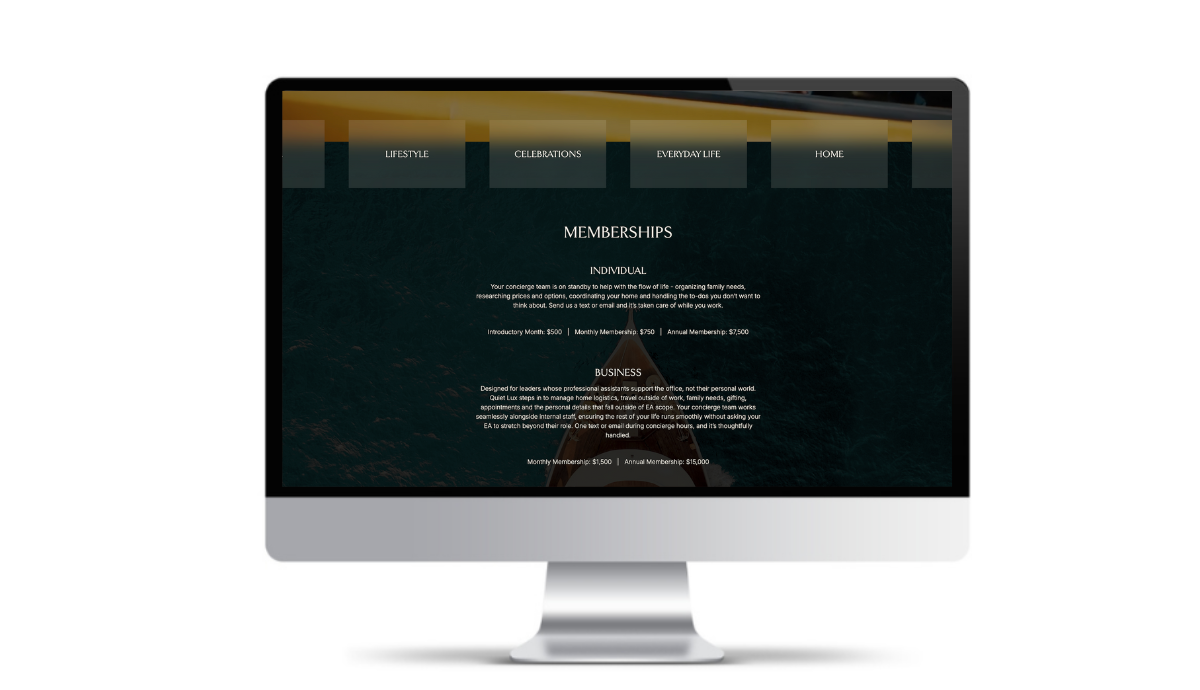 Designed and developed the Quiet Lux website after the client came to me seeking help elevating their online presence and creating a more refined, luxury-forward experience. The project began in Figma to establish a clear visual direction before being developed in Webflow. The site supports a concierge app focused on simplifying everyday life, major projects, and personal goals with privacy and precision. Custom JavaScript-powered chat and text bubble interactions add a subtle, human-centered touch.
